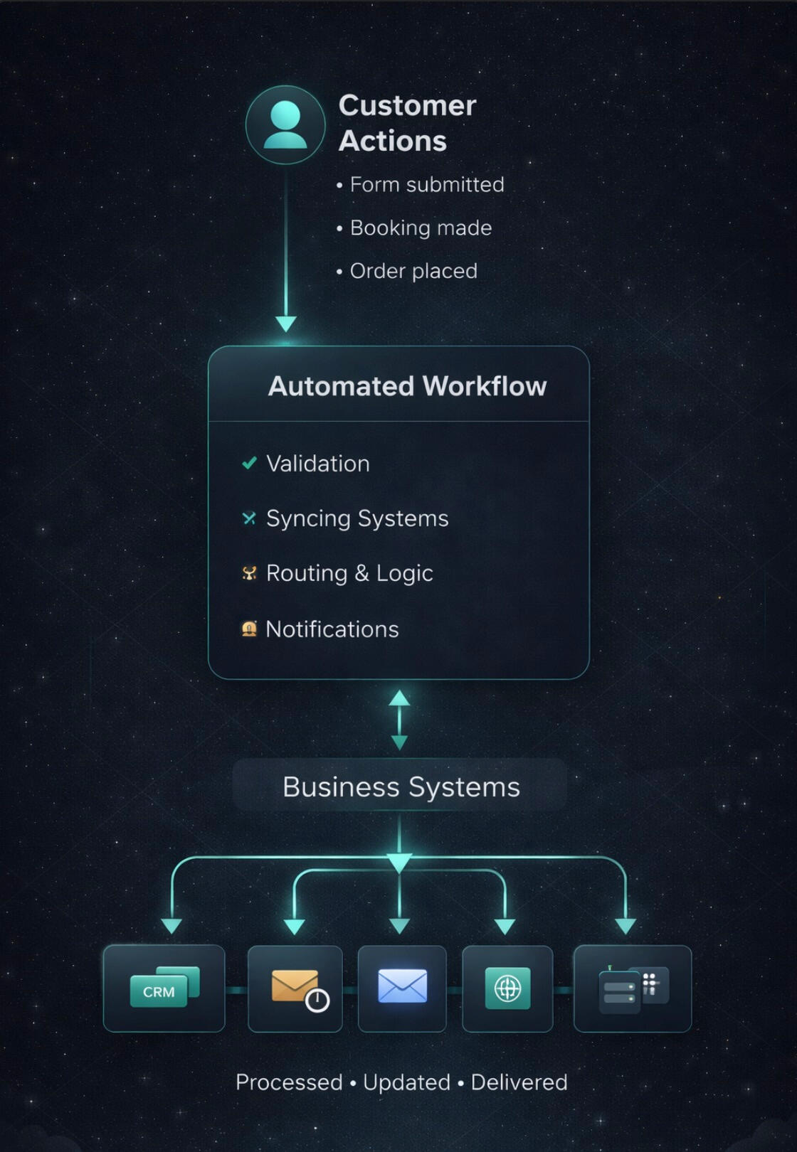Turn forms, bookings, and customer actions into automated workflows that update systems, trigger follow-ups, and move work forward automatically.